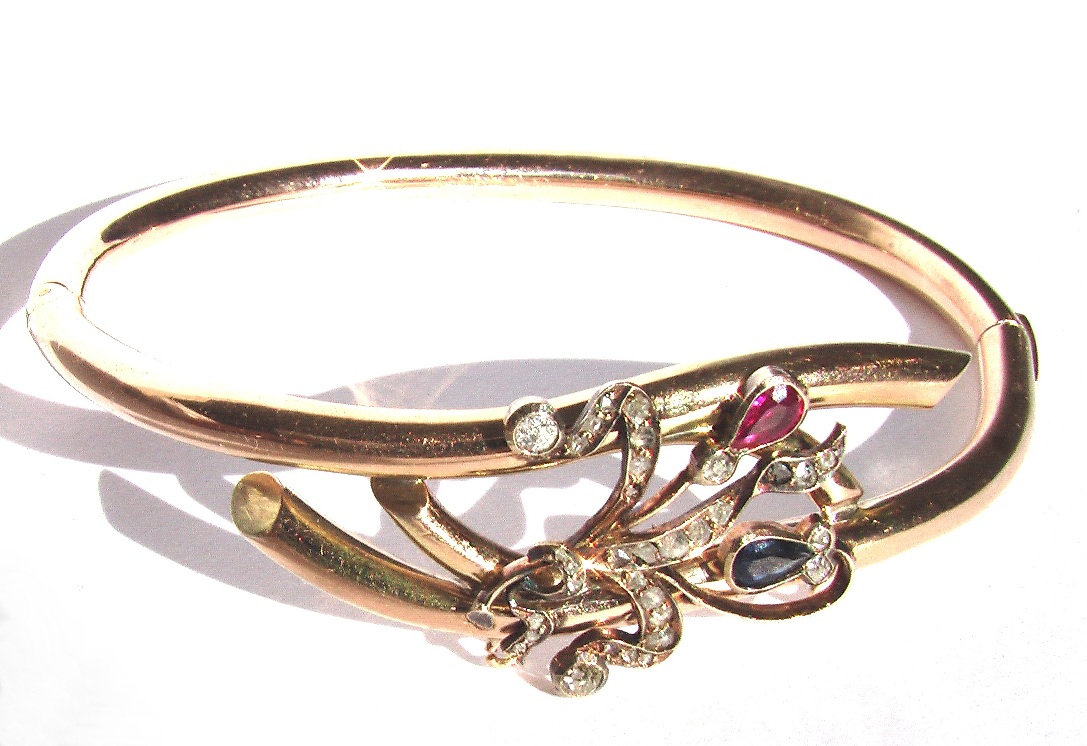 Золото 56 пробы ( Россия, мастер АК ) , 33 природных натуральных бриллианта старинной огранки “роза”, рубин и сапфир. Размер акцентированной части около 3,70 см на 2,0 см. Внутренний размер овала 5,8 см на 4,4 см. Общий вес – 10,6 гр. Состояние на фото. Россия, кон. XIX – нач. XX в.